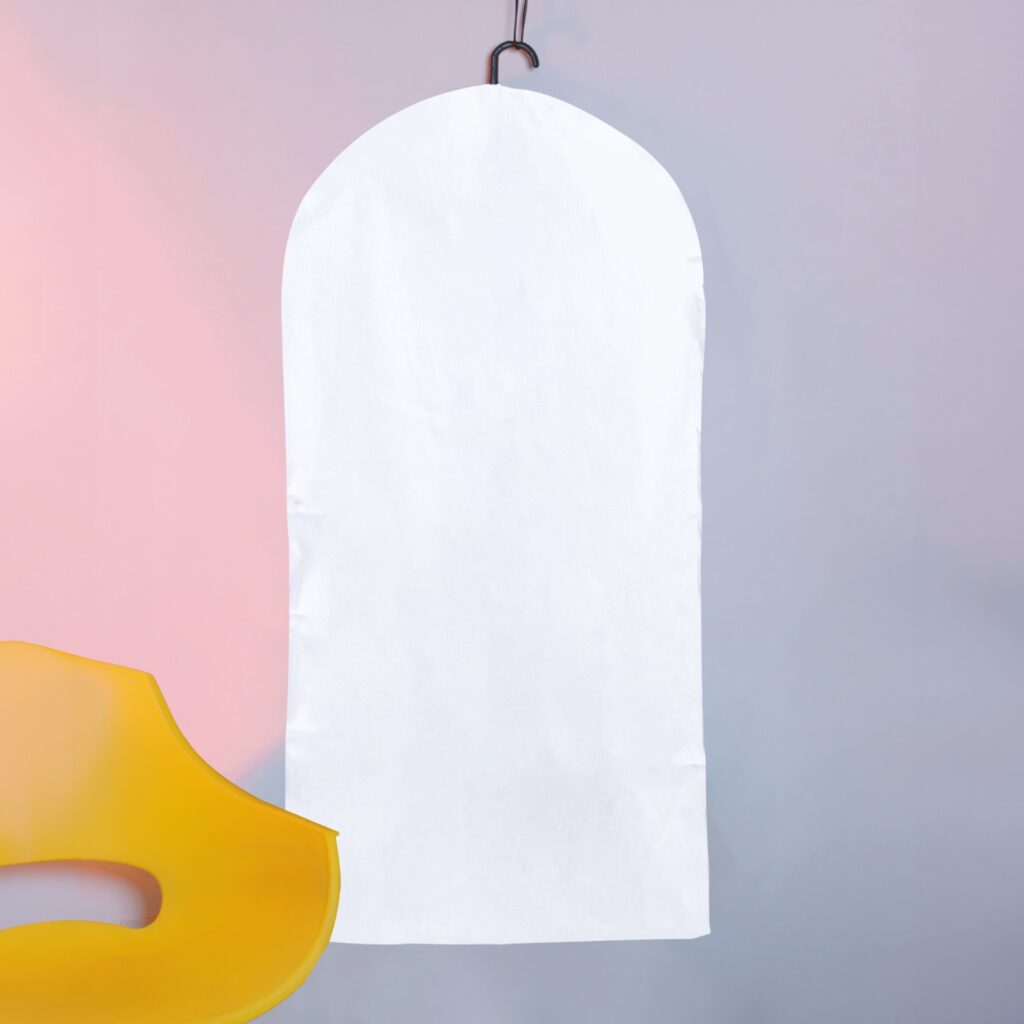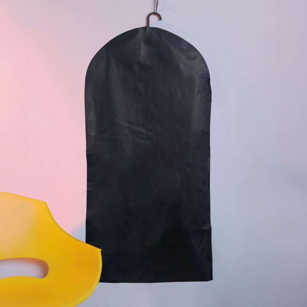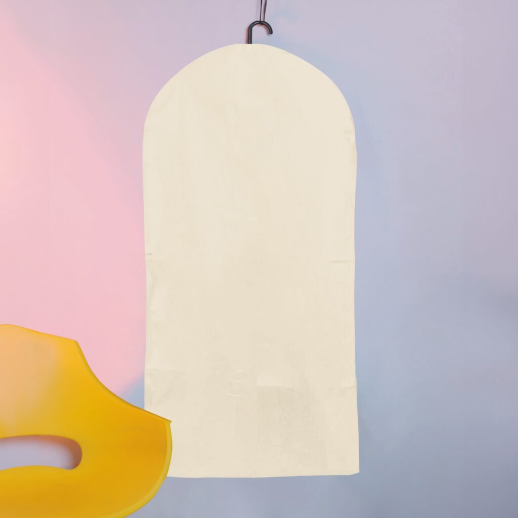 Housse costume élégante fabriquée en tissu non tissé 100 % polypropylène. Ce modèle, sans fermeture ni biais, est disponible en plusieurs couleurs.